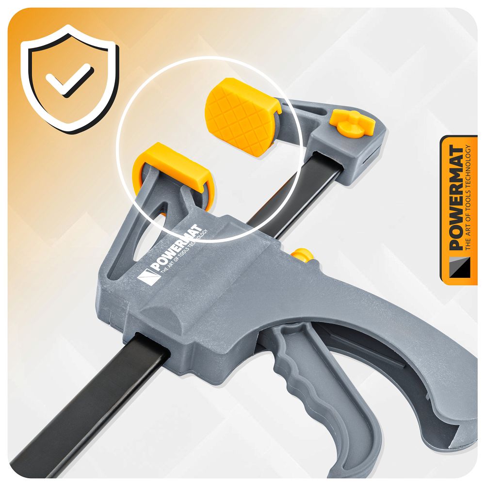 Čeljusti su opremljene mekim zaštitnim navlakama koje sprječavaju grebanje i deformaciju površine. To čini alat sigurnim za drvene, metalne i površinske elemente. Visokokvalitetni materijali korišteni u vodilici i mehanizmu jamče izdržljivost i otpornost na intenzivnu upotrebu. Dizajn stezaljke ostaje stabilan čak i pod visokim pritiskom.