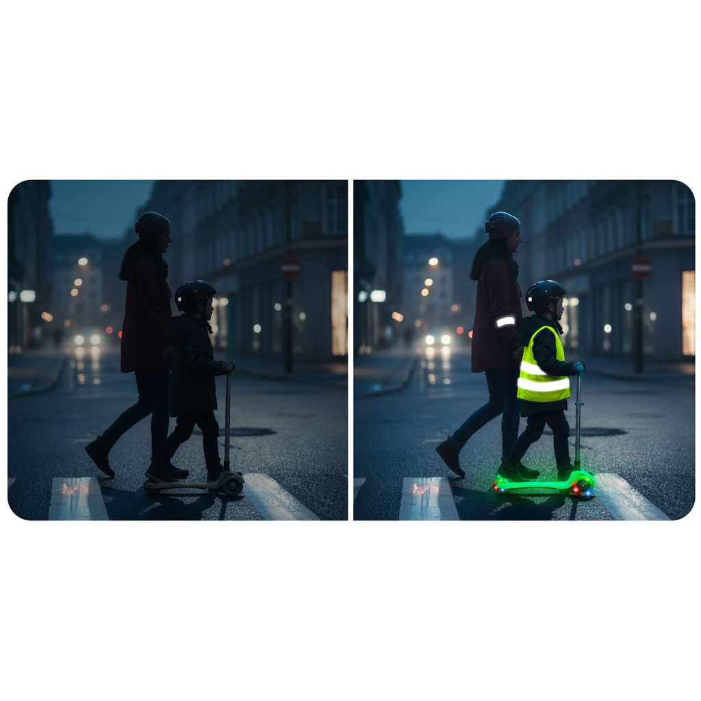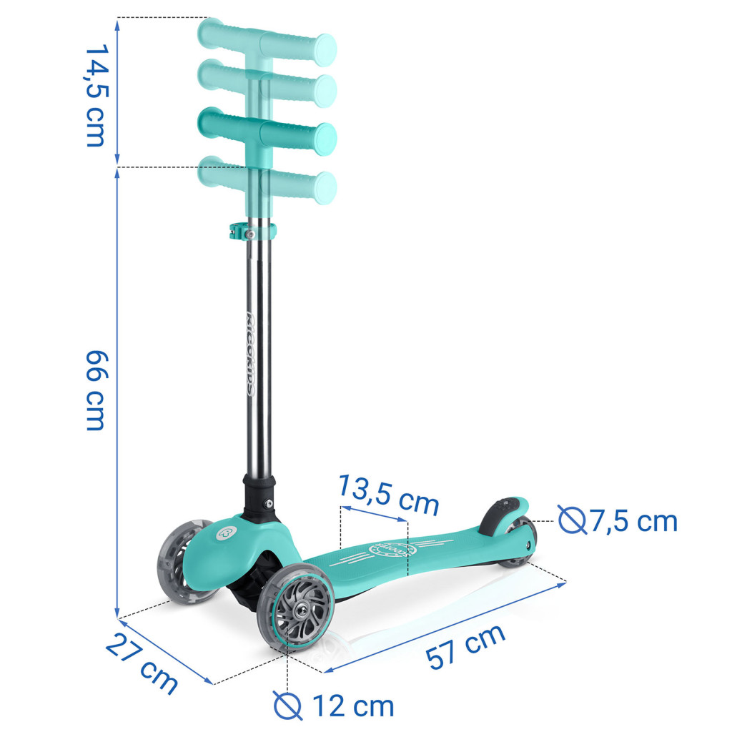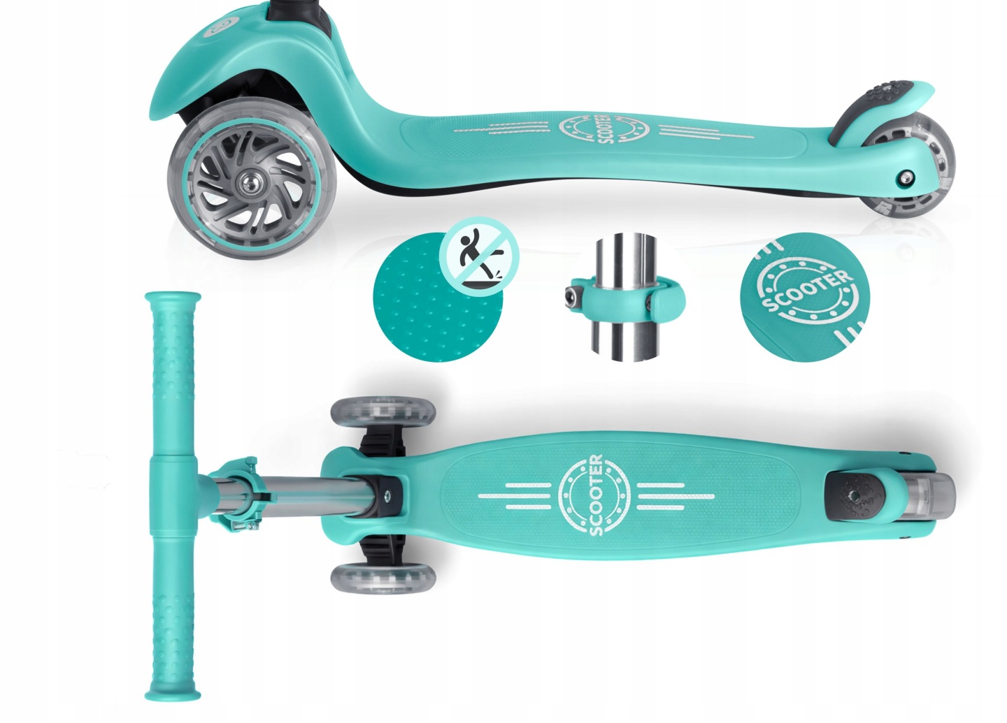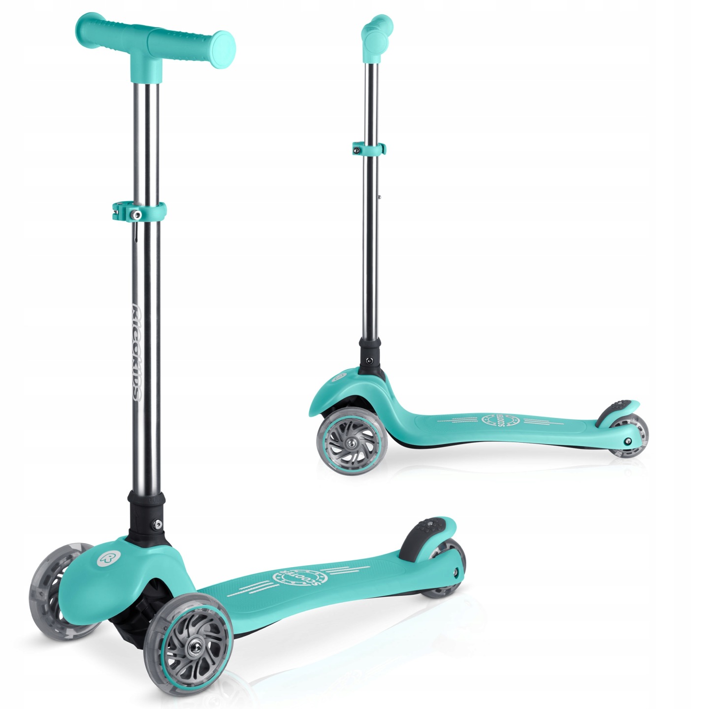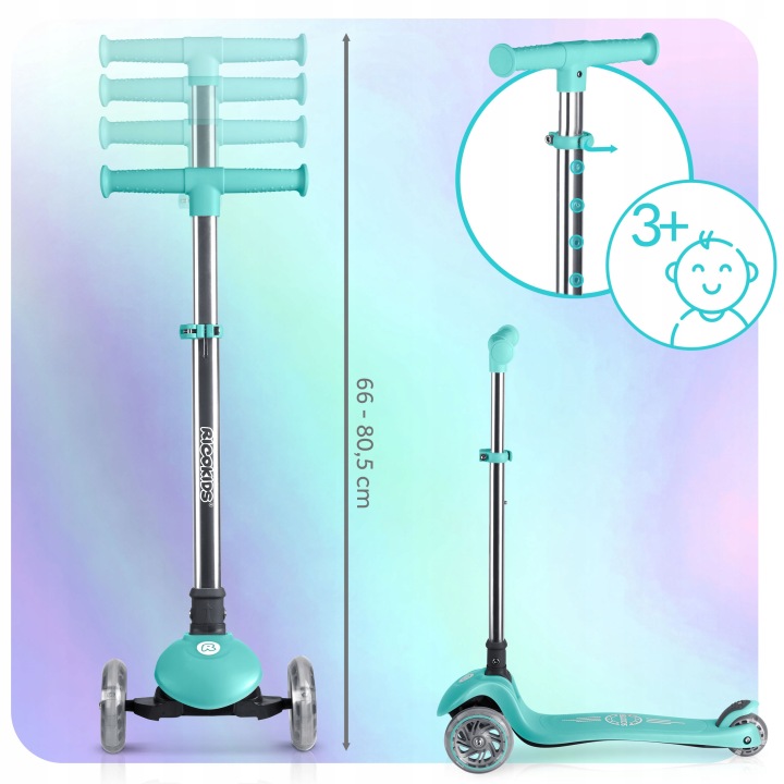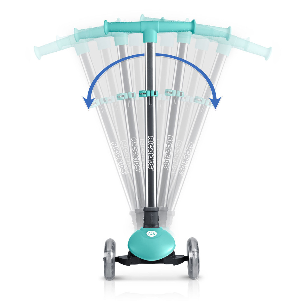 Svjetleći trokotačni skuter, tirkizni | Ricokids Glow nudi stabilnu vožnju i zabavno osvjetljenje koje povećava vidljivost tijekom kretanja. Skuter osigurava stabilnu i udobnu vožnju, dok upravljanje naginjanjem tijela podržava prirodni razvoj ravnoteže i koordinacije.
