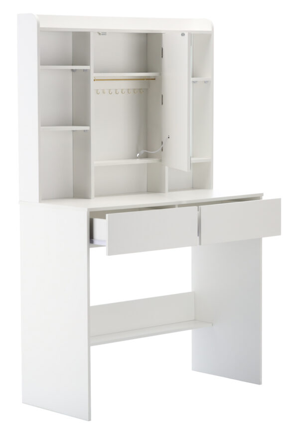 Zahvaljujući LED rasvjeti, vaša priprema je ravnomjerno osvijetljena – idealno za nanošenje šminke ili oblikovanje kose. Čisti bijeli dizajn s minimalističkim linijama daje vašem interijeru moderan i uredan izgled. Ovaj komad namještaja savršen je za spavaću sobu ili garderobu i pomaže u održavanju urednosti.
