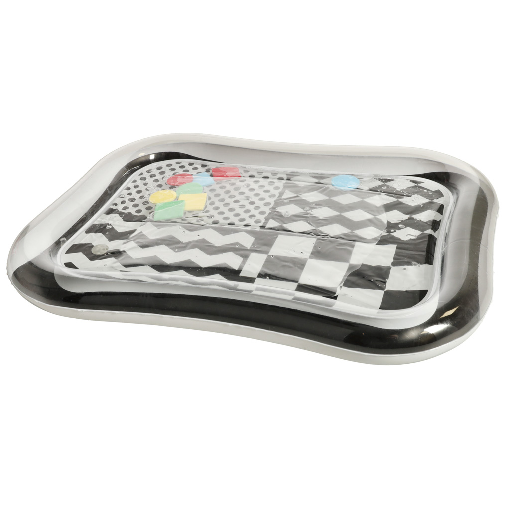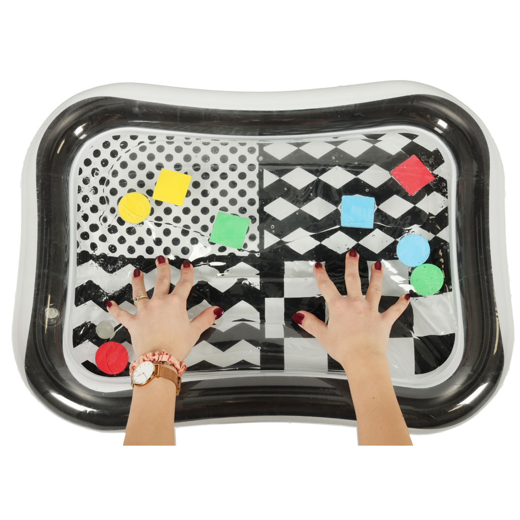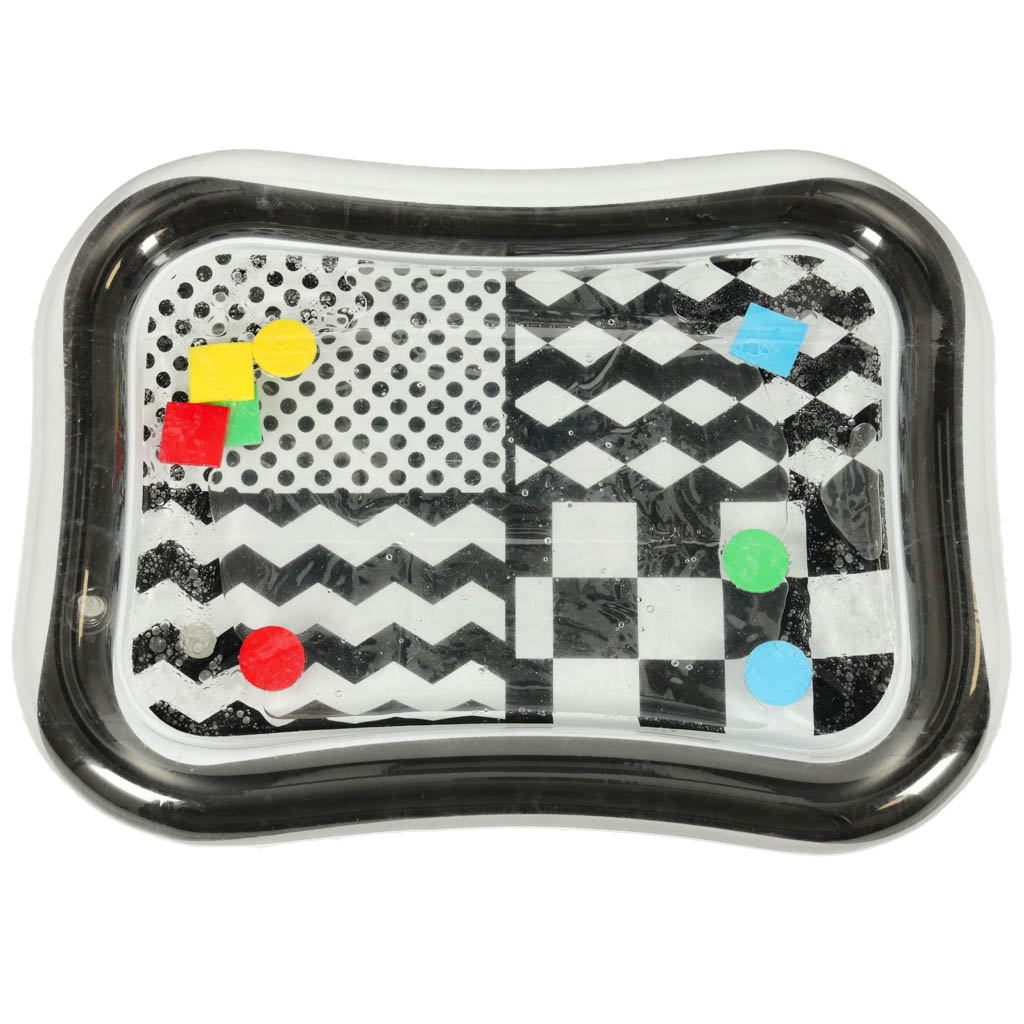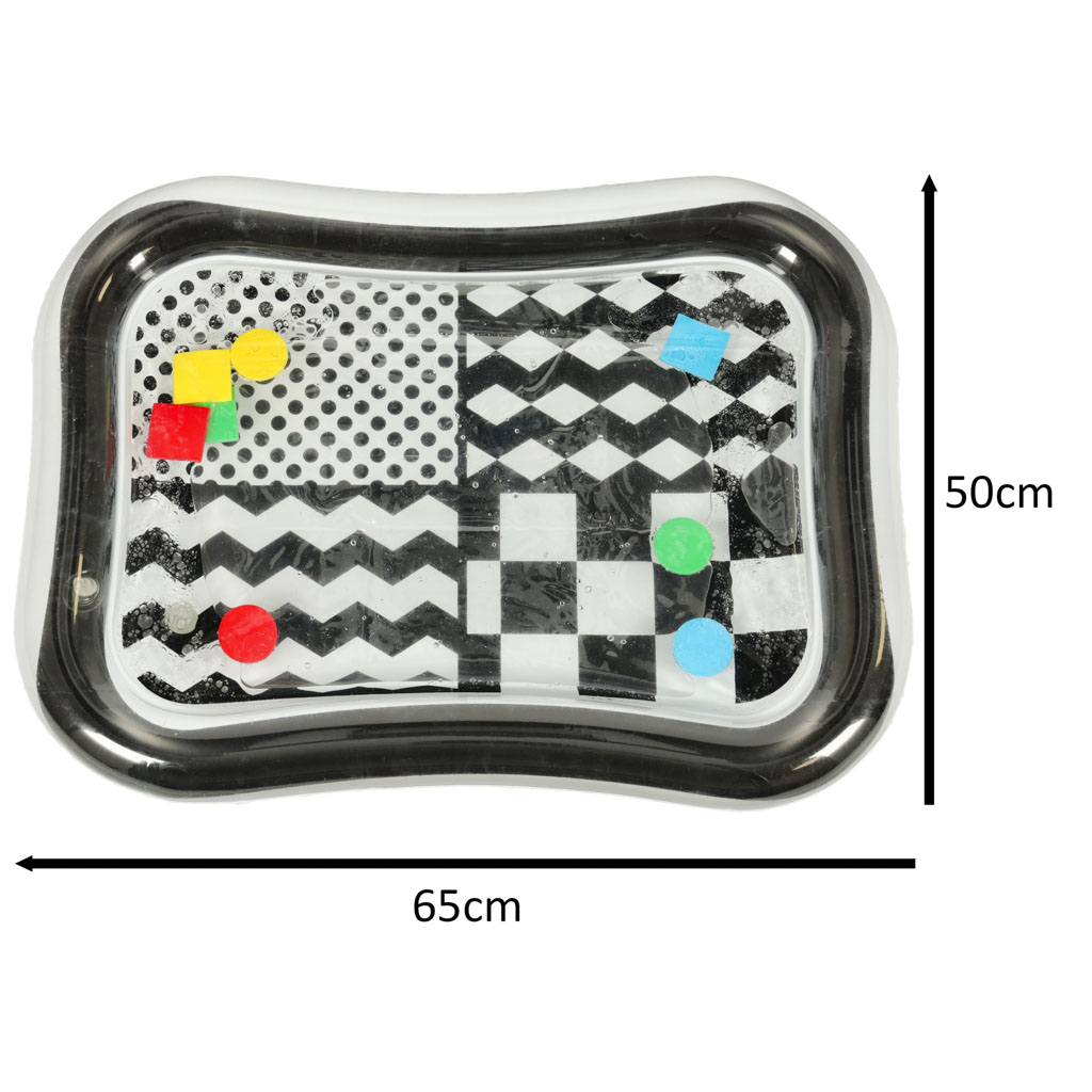 Vodena podloga za djecu, 65x50cm | crno-bijela je senzorna podloga na napuhavanje s kontrastnim elementima, koja će biti idealna igračka za mališane. Koristi se za punjenje vodom i podržava zabavnu igru za najmlađu djecu. Šareni geometrijski oblici unutar podloge privlače pažnju mališana i motiviraju ih na aktivnost. Igračka razvija ručne i intelektualne vještine te pomaže djeci da prepoznaju boje i geometrijske oblike.