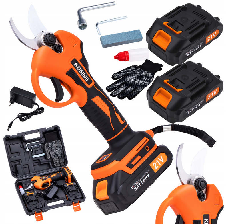 Vrtne škare na baterije, 2x21V, 2Ah | KD5090 praktični su pomagač za jednostavno i udobno rezanje grana i grmlja bez napora. Riječ je o visokokvalitetnim električnim škarama koje nude laganu konstrukciju, prenosivost i jednostavno rukovanje uz smanjeni napor. U usporedbi s tradicionalnim ručnim škarama, rade do deset puta učinkovitije i pružaju znatno veću kvalitetu rezanja. Visokougljični SK5 čelik oblikuje oštrice i osigurava njihov dugi vijek trajanja i preciznost. Neklizajući materijal na dršci osigurava čvrsto i sigurno držanje tijekom rada. Praktična kutija štiti cijeli set i olakšava nošenje i pohranu.