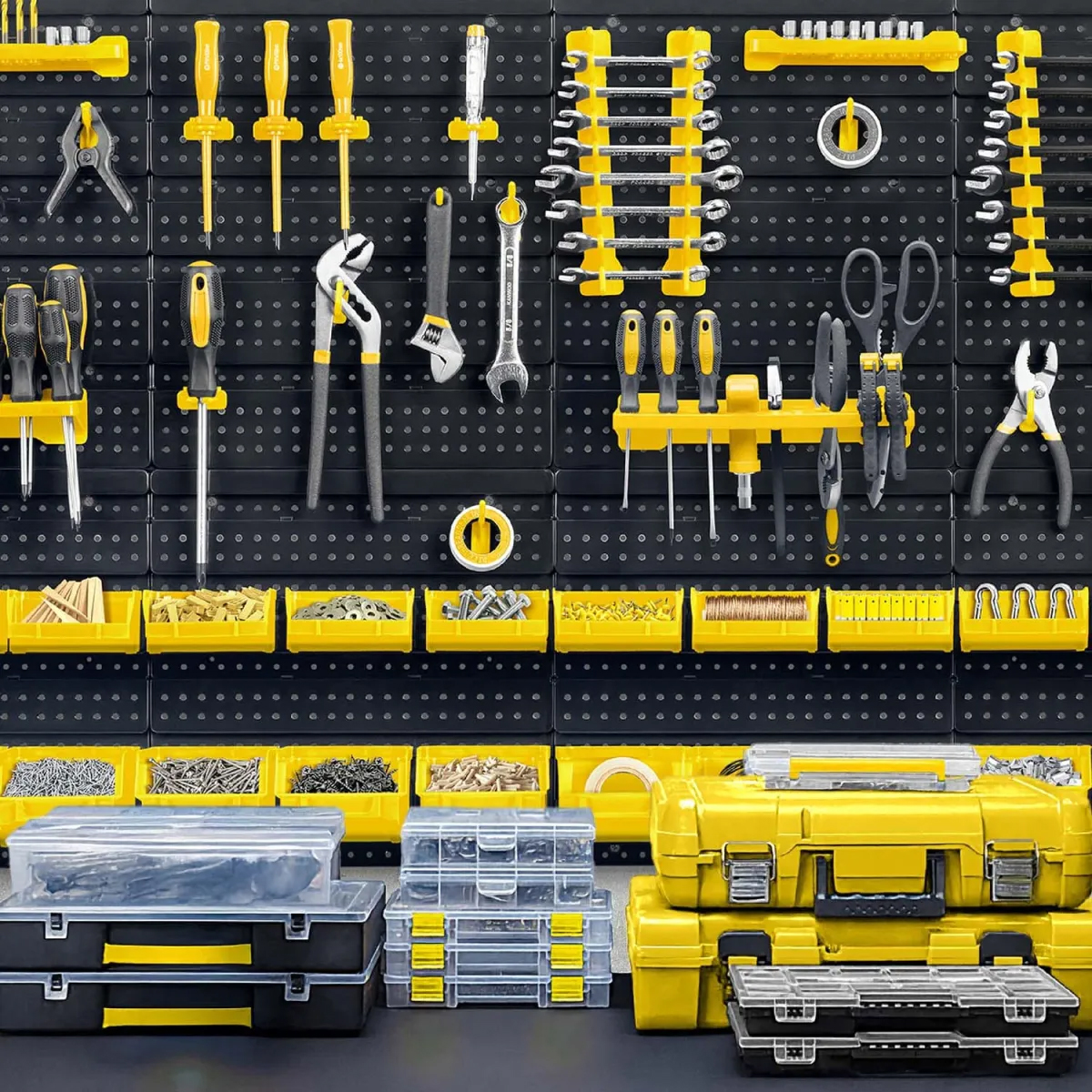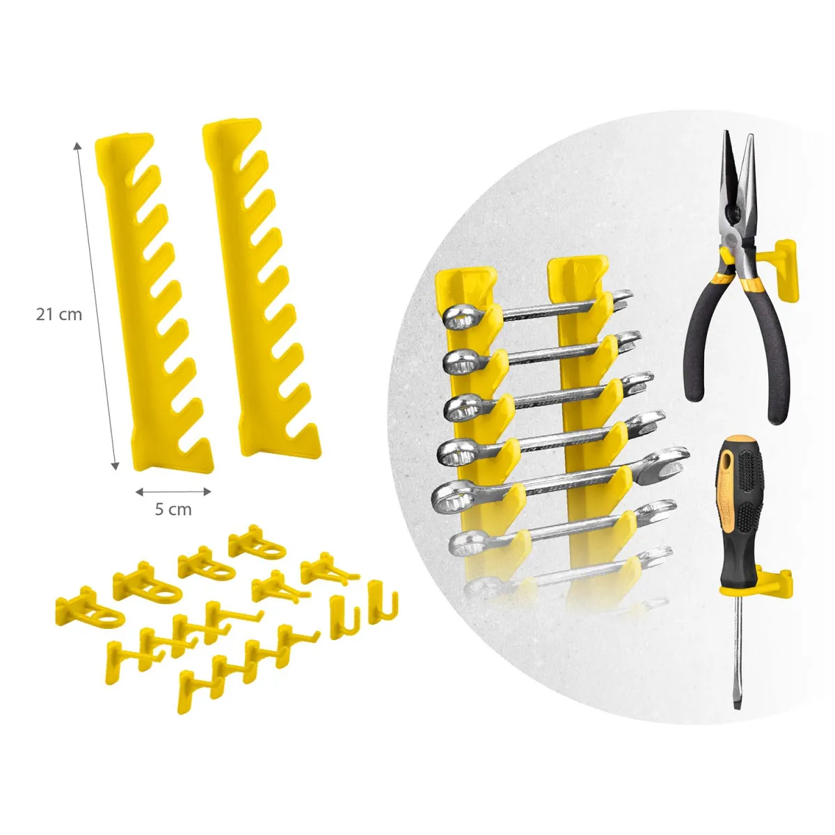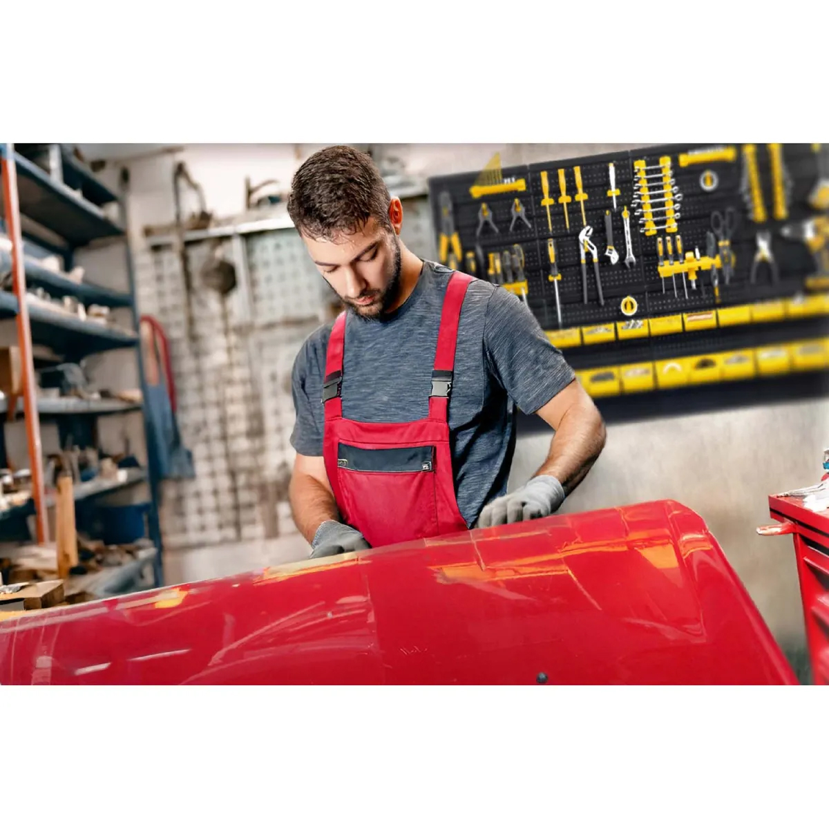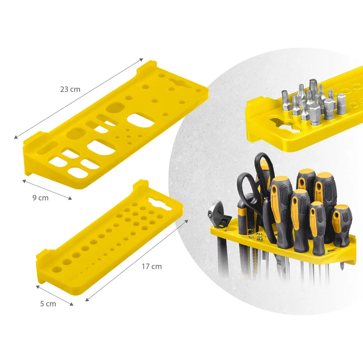 Zid za alat u radionici HM-580, 128x76cm, žuti | Humberg je praktična organizacijska ploča koja će vam pomoći da vaša radionica bude organizirana. Set uključuje do 54 dodatka (kivete, kuke, police, nosači), koje korisnik može slobodno postaviti prema vlastitim potrebama, što omogućuje potpuni, prilagođeni dizajn radnog prostora.