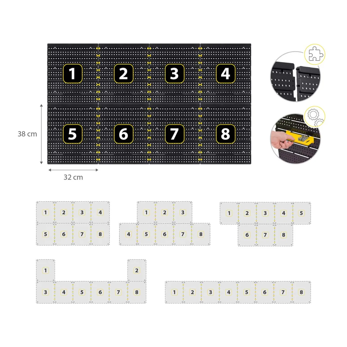Ploča se sastoji od 6 modularnih dijelova koji se spajaju u jednu površinu. Proizvođač je odabrao materijale s naglaskom na izdržljivost – izdržljive plastične komponente nadopunjuju robusnu bazu ploče. Zahvaljujući ovom proizvodu, zid možete učinkovito koristiti za organiziranje vijaka, alata, ključeva i većih dijelova, dok svaki komad alata ima svoje fiksno mjesto i uvijek je pri ruci.
